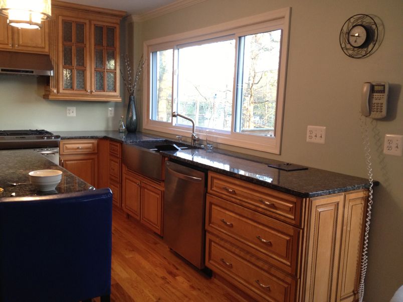 "I chose Kitchen Cabinet Discounts' LIGHT CARAMEL ROPE because the rope trim on the cabinets had a nautical look, and came with gorgeous matching glass doors that had more rope trim around each glass pane. The cabinet doors were solid maple/birch, and the cabinets came with dovetail drawers and full extension glides. When it came to selecting granite, I avoided light colored granites and marble that wouldn't pass the spilled wine test, and selected a deep, rich sapphire blue to highlight the sea motif. I added sapphire blue chairs to the island to complement the granite and our sea foam green walls, and installed nautical lanterns above the island. Oh, and I absolutely LOVE my double apron farm sink. It's 36" wide and is the biggest, deepest sink I've ever had. It hides everything! In fact, there were probably dishes in there when I took the pic."