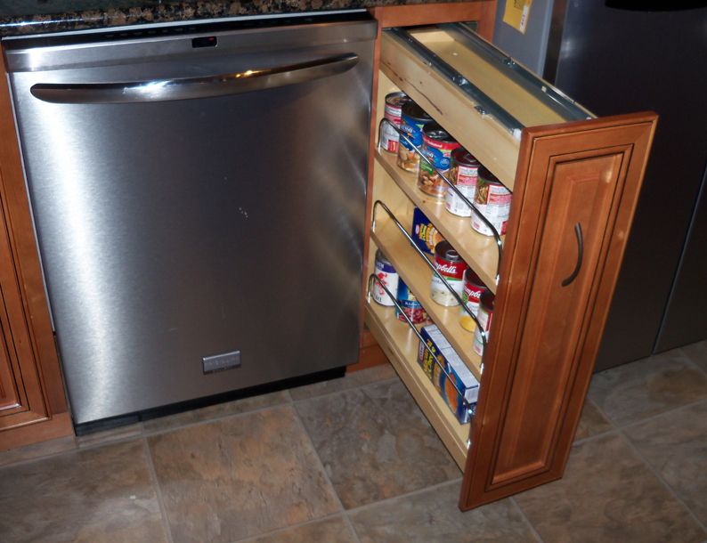 "We love the design and the quality of our cabinets. Being able to adjust the shelves of the cabinets the way we want to since there are so many pre-drilled holes in each cabinet is another nice feature. Our friends couldn't believe how much -- or rather, how little - we paid for our cabinets with solid wooden doors and drawers, plywood construction, dovetailed drawers, and soft close glides. And EVERYBODY loves the rollout base pantry. When a friend of ours who is a real estate agent visited, she said, 'Your kitchen alone will sell this house.' But we don't plan to move anytime soon. We're enjoying the new kitchen and the house again." - Marcy