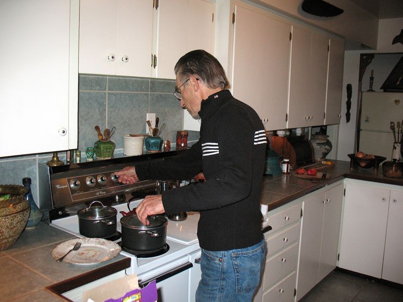 Robert and Sheri E. own a sprawling mid-century modern home in the state of Washington that features soaring ceilings and enormous windows that flood the interior with light, allowing the natural beauty of the outdoors to merge with the beauty of the 300 plants the couple nurture inside their home. Since 2000, the year they bought their fixer-upper, the industrious couple remodeled one room in the house after another. Although they replaced the kitchen linoleum and the laminate countertop with porcelain tile along the way, it was in 2013, at age 74, that Robert decided to renovate the rest of the kitchen from the ground up. According to Robert, the old kitchen was "cold and unimaginative." It was large, but had no seating space anywhere along the lengthy counters, and the washer and dryer occupying the space under the window were visible to all. He and Sheri, both wonderful cooks and bakers, (as this tantalizing fruit custard decorated with edible blue borage and red oswego flower petals attests), wanted a kitchen that would utilize their space better, and be more in harmony with the open floor plan of the rest of their home.