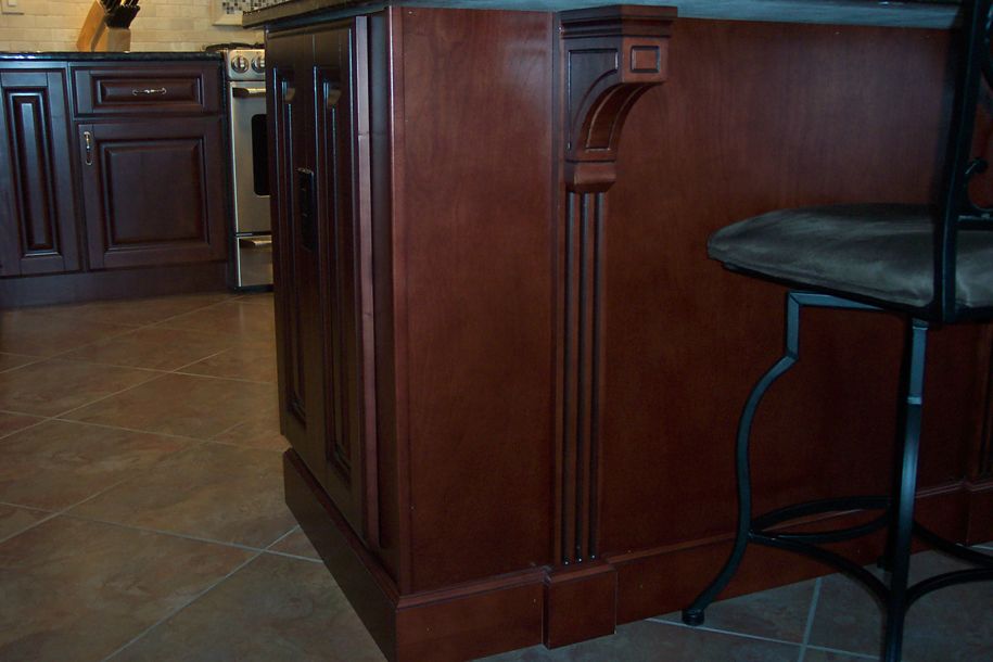 Wanting a change from the white cabinets they had, Bill and Loretta chose Kitchen Cabinet Discounts' IMPERIAL MAHOGANY cabinets, attractive stainless steel appliances, and a steel hood. They placed variegated rust/green colored tile on a diagonal on the floor, and added light beige tavertine subway blocks as a backsplash. They also centered a rust color and beige mosaic rectangle above their stove to accentuate their verde green granite, so now have a sophisticated, elegant kitchen. A fluted wall filler, corbel, and decorative panels helped finish off the back and side of the peninsula.